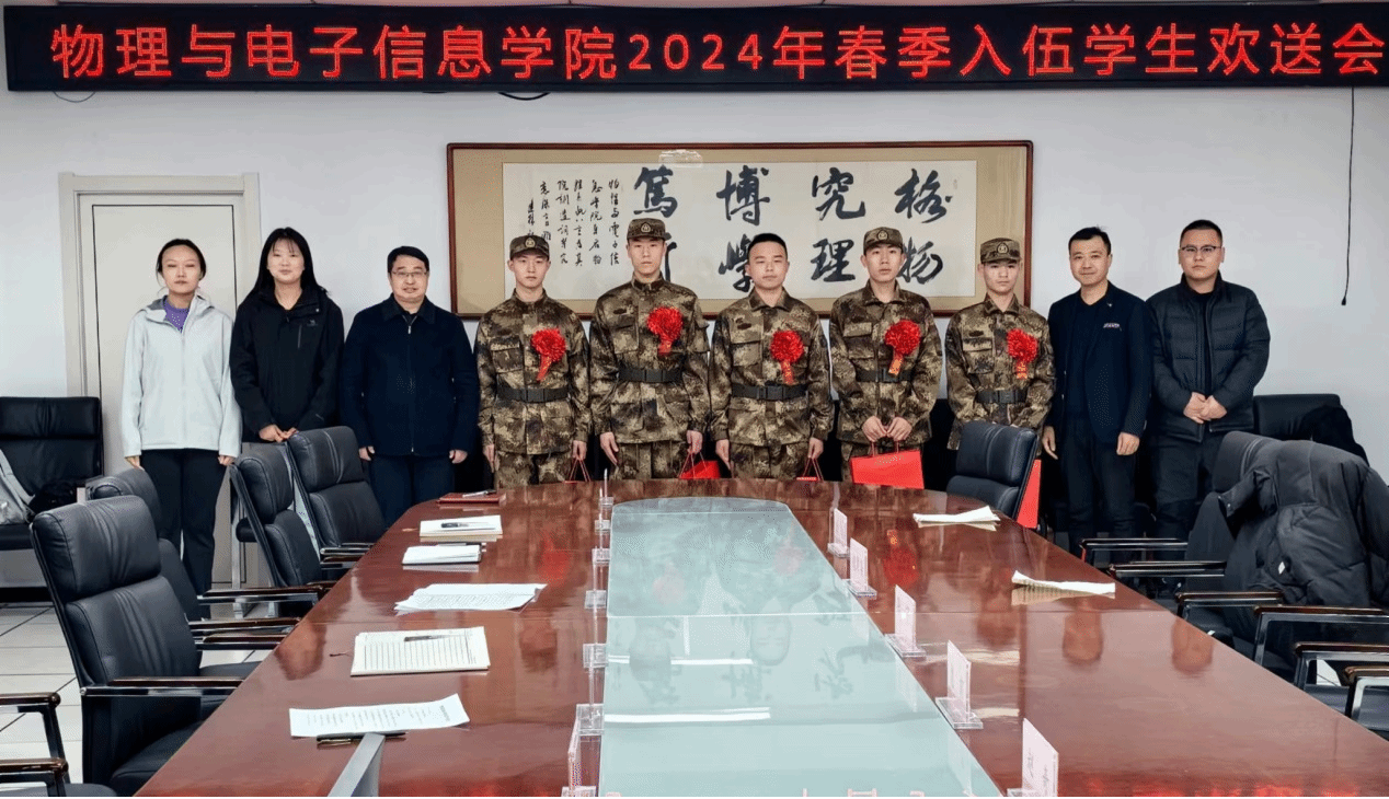 会上,李虎林老师介绍了公司2024年春季应征入伍报名、体检、政审等相关情况,宣读了春季入伍老员工名单。与会的领导老师为新入伍老员工佩戴大红花、颁发纪念品。新入伍员工在发言中,分别介绍自己立志从军,积极准备到梦想实现的经历和感悟,纷纷表达了对母校的感激之情,表示一定不负保家卫国的神圣使命,做一名让祖国、人民、公司和家庭放心的合格军人。各位同学代表在发言中赞扬他们携笔从戎、投身军旅、保家卫国的慷慨举动,对他们即将开启的军旅生涯表达了美好的祝愿。退役复学员工代表物理21班苗雨花在发言中分享了自己的军旅生涯,希望各位新兵珍惜荣誉、严格锻炼,早日成为一名优秀军人。辅导员代表王蕊老师向新入伍的同学们表示祝贺,并希望他们入伍后继续践行延安精神,牢记使命担当,为祖国的国防事业贡献延大学子的青春和力量。杨能勋副经理介绍了公司在参军入伍方面的各项学业政策,并希望同学们要充分发挥专业优势,在部队中建功立业,为新时代党和国家的强军事业作出应有的贡献。