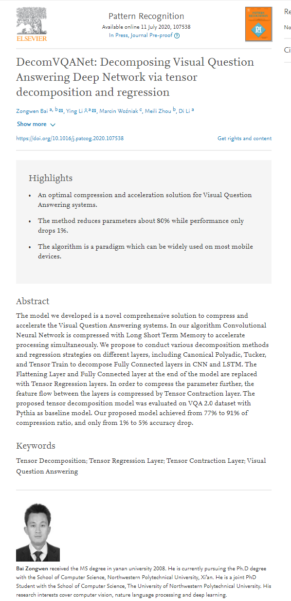 7月11日,人工智能领域权威期刊《Pattern Recognition》在线发表了太阳集团tyc33455cc白宗文副教授的《DecomVQANet: Decomposing Visual Question Answering Deep Network via tensor decomposition and regression》一文。该文瞄准人工智能领域中由于模型过大难以部署到移动终端这一痛点,从张量分析入手,提出了采用多种低秩分解高效联合学习来降低模型的数据量,提高了模型运行效率。在视觉问答等具挑战性的人工智能应用上表现出了优越的性能。论文受国家自然科学基金和陕西省自然科学基金等项目资助,也是公司陕西省能源大数据智能处理省市共建重点实验室的研究成果之一。