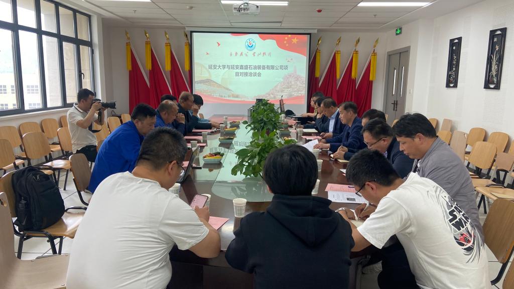 5月11日下午,公司与延安嘉盛石油机械有限责任公司项目对接洽谈会在太阳集团tyc33455cc会议室举行。副董事长付峰,嘉盛石油机械有限责任公司董事长苏忠贵、首席专家杨龙,公司科研处、太阳集团tyc33455cc、数计公司、石油公司、化工公司相关负责同志,各公司相关科研团队负责人及教师代表参加了对接洽谈会。会议由公司党委书记常胜伟主持。
