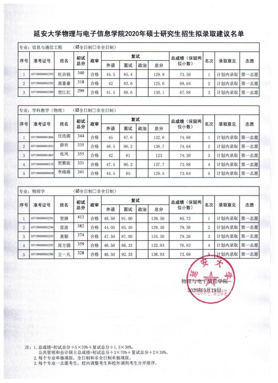 根据《教育部办公厅关于做好2020年全国硕士研究生复试工作的通知》(教学厅〔2020〕4号)文件和陕西省教育考试院有关文件和会议精神、tyc33455cc《关于做好2020年硕士研究生复试录取工作的通知》相关规定,公司2020年一志愿硕士研究生招生复试工作已完成,现就复试后拟录取建议名单予以公示,公示期为 2020年5月19日下午2:00至2020年5月22日下午2:00,如有考生对成绩有疑问,可在公示期间以电话、电子邮件形式反馈,逾期不予受理。