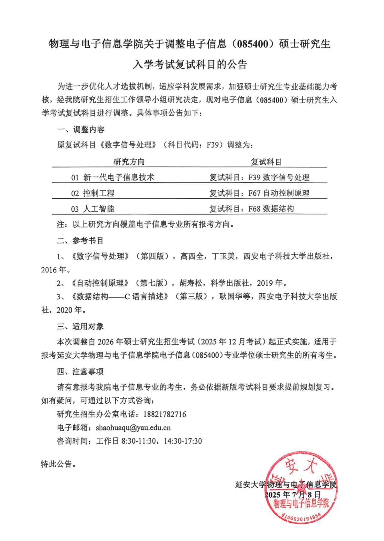 关于调整“电子信息”研究生入学考试复试科目的公告