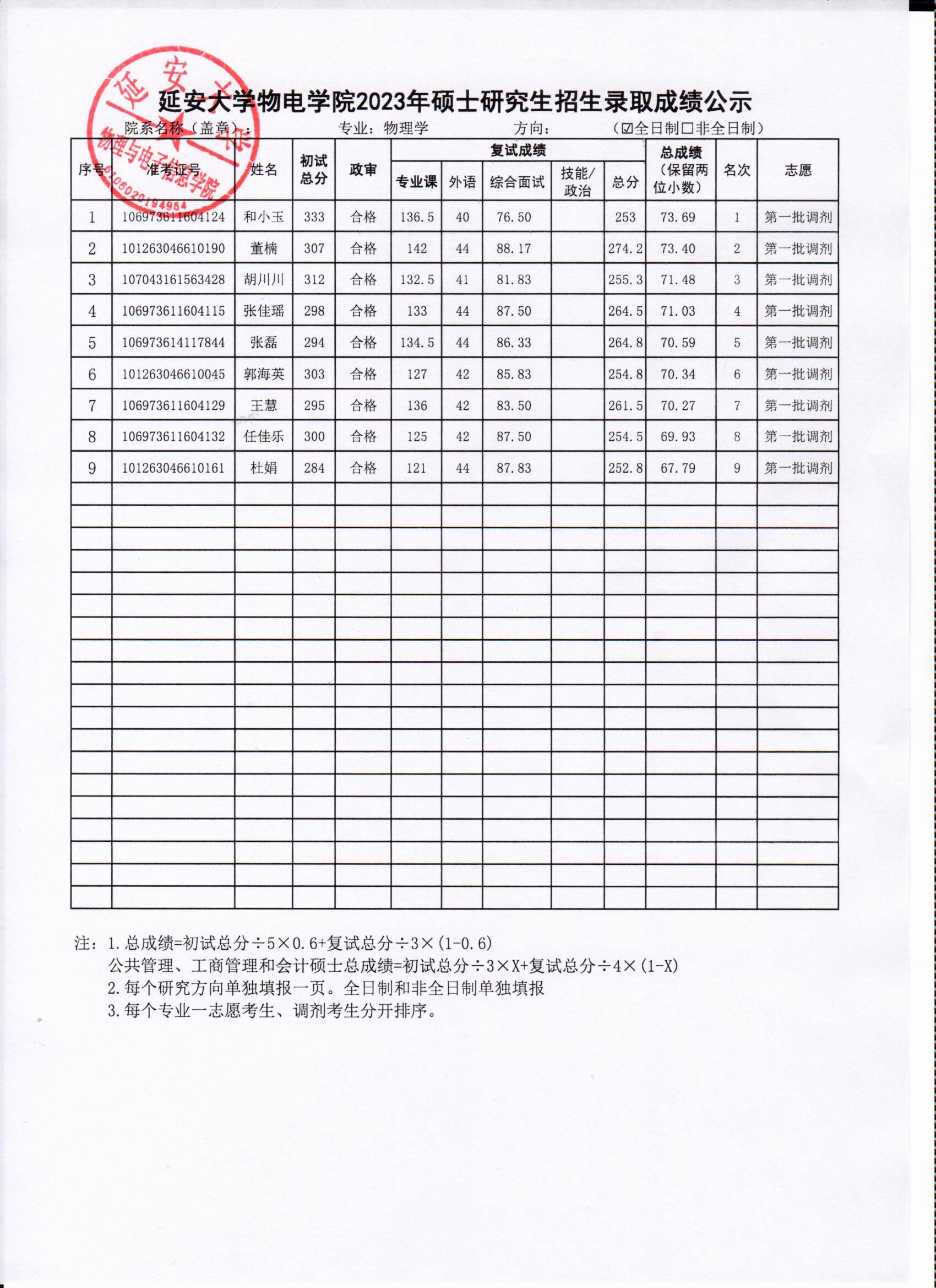 依照公司2023年硕士研究生复试工作实施方案,安排在2023年4月9日的物理学调剂考生复试工作已经圆满结束,现将具体的复试成绩进行公示,公示时间为十个工作日。