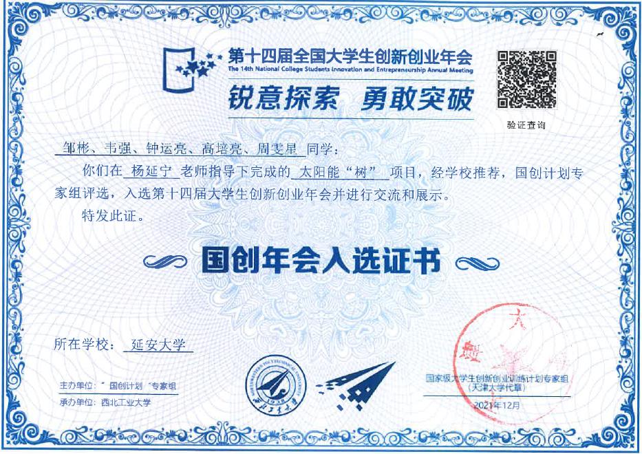 公司杨延宁教授指导、员工邹彬主持完成的“太阳能树”的研究与设计国创项目成功入选,是公司唯一入选的大创项目,该项目于2017年立项,项目利用仿生学原理,设计了一种具有太阳能发电的景观树,该设计可通过云平台带动光伏铭板朝向光侧转动,最终实现太阳光的自动跟踪,不仅能提高光伏发电的效率,还能作为景观树。通过参加本次全国老员工创新创业年会,提高了公司的知名度,同时进一步深化高校创新创业教育改革,加强公司与其他公司的交流与沟通,为员工搭建创新创业交流展示平台,展示高校创新创业教育方面的成果,促进高校创新创业教育和文化建设。该项目的入选,是公司老员工创新创业工作的一个突破。