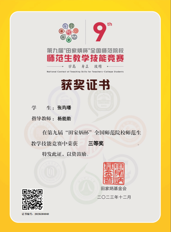 据悉,在第七届和第八届“田家炳杯”全国师范院校师范生教学技能竞赛公司员工物理19班员工刘萌、史欣雨荣获三等奖。